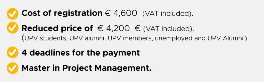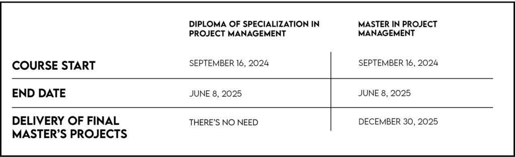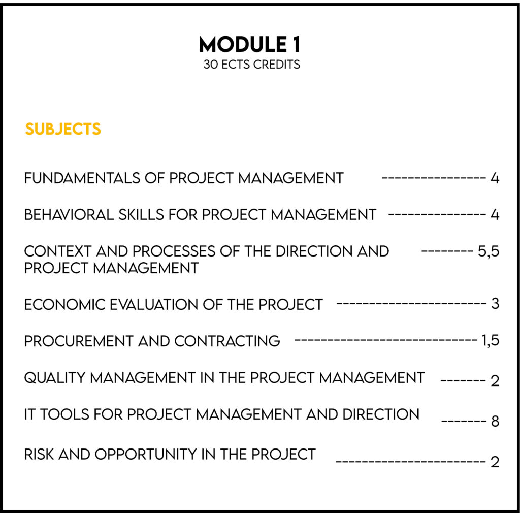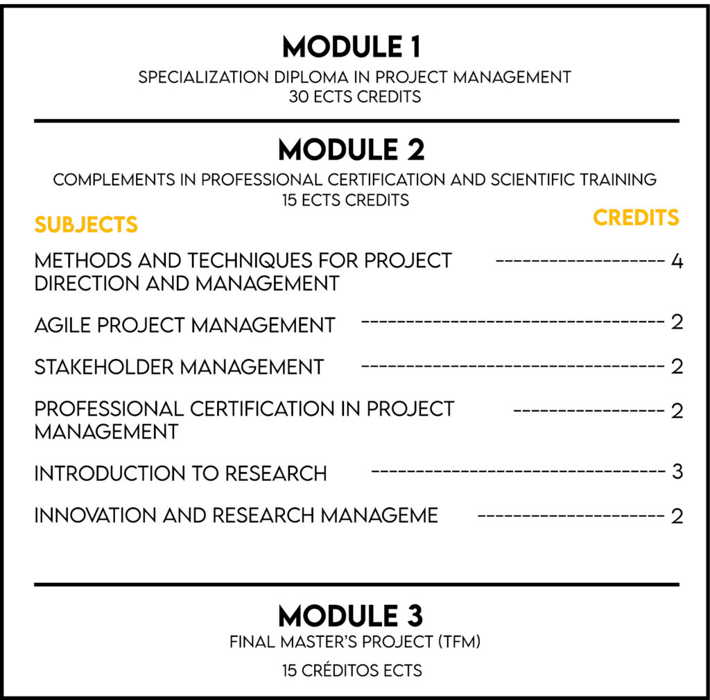 The Master (60 ECTS) and the Diploma in Project Management (30 ECTS) have a modular structure and can be carried out in one or two academic years. Obtaining the Master’s degree implies the development and defense of a Master’s Final Project (TFM). Students who complete the Diploma training also have a preferential route to continue the master’s degree.
