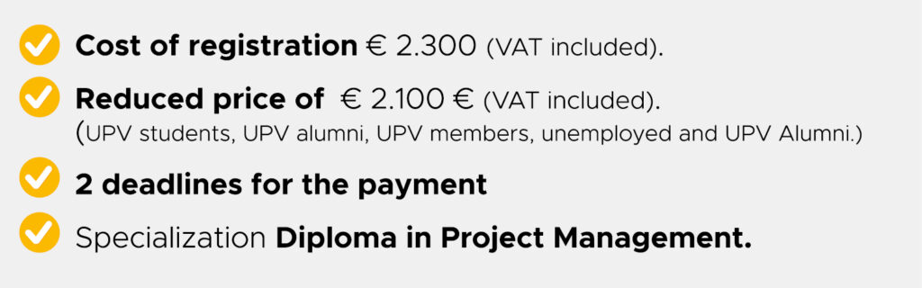 In order to access the Master in Project Management or the Specialization Diploma, it is necessary to have been awarded a university degree (first cycle, second cycle or equivalent, university degree or master’s degree).